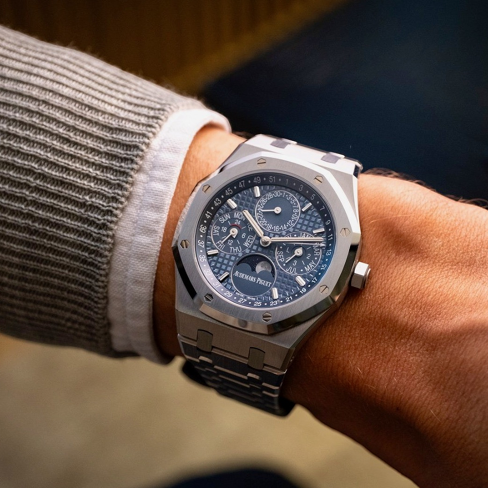 The Audemars Piguet Royal Oak Perpetual Calendar (ref. 26674ST.OO.1320ST.01) is a modern take on AP’s flagship complication: a 41mm stainless-steel Royal Oak with a blue dial and a redesigned perpetual calendar engineered for improved day-to-day usability. This generation introduces AP’s Calibre 7138, positioned as a more ergonomic perpetual calendar architecture—built to keep the complication practical without sacrificing the Royal Oak’s iconic design language. (Audemars Piguet)