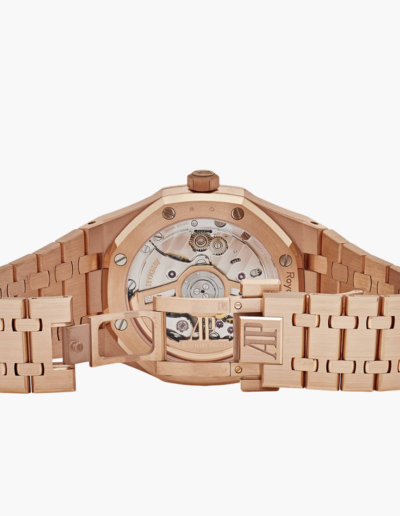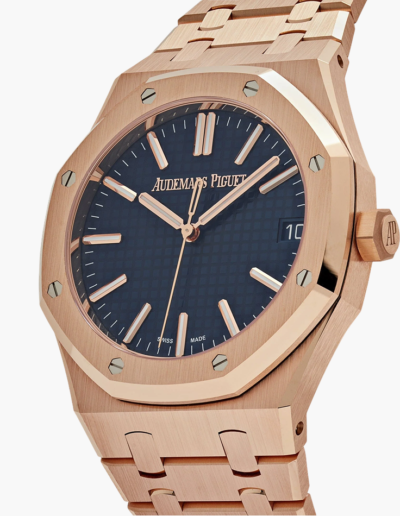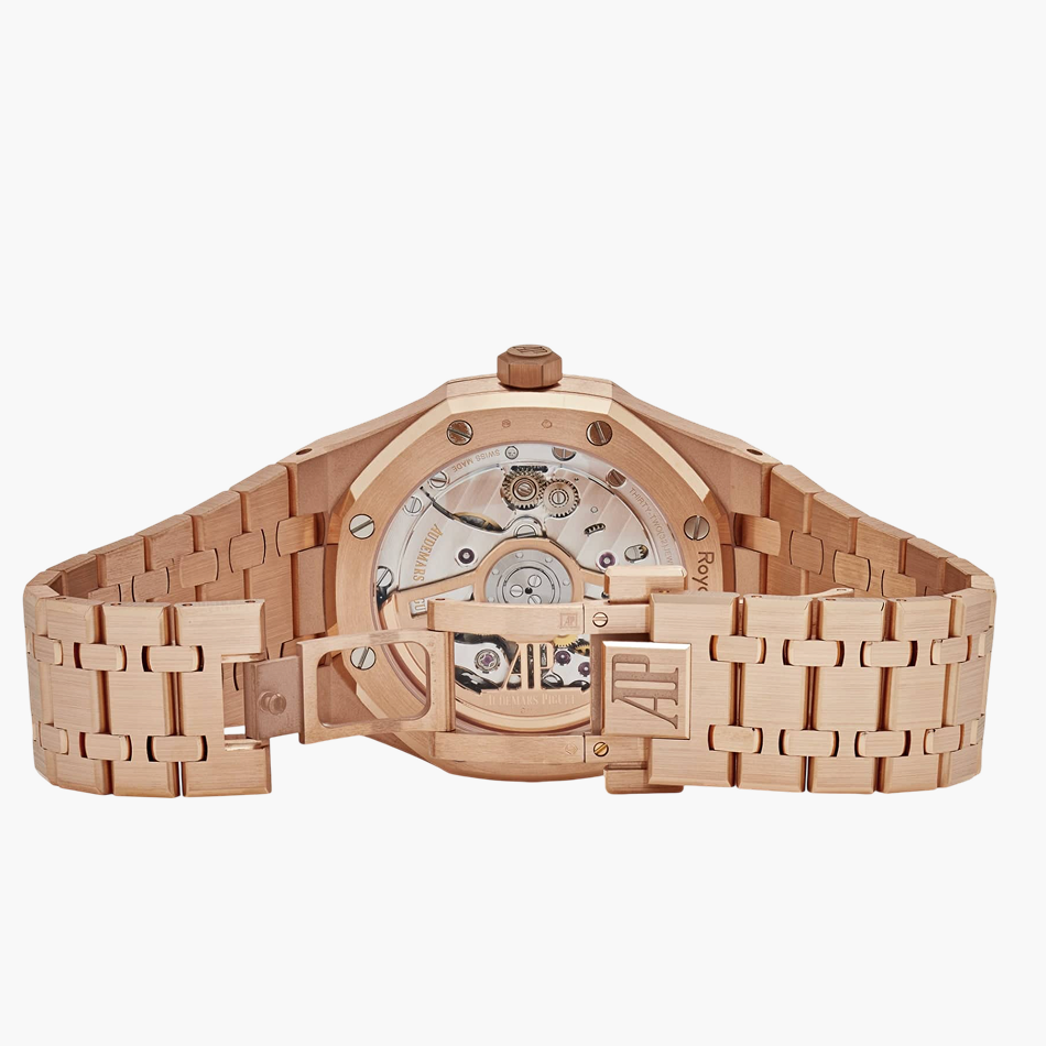 Pink gold hour-markers and Royal Oak hands, graced with luminescent coating, ensure effortless readability in any setting. The date window at 3 o’clock seamlessly integrates into the dial, maintaining a perfect balance of form and function.
