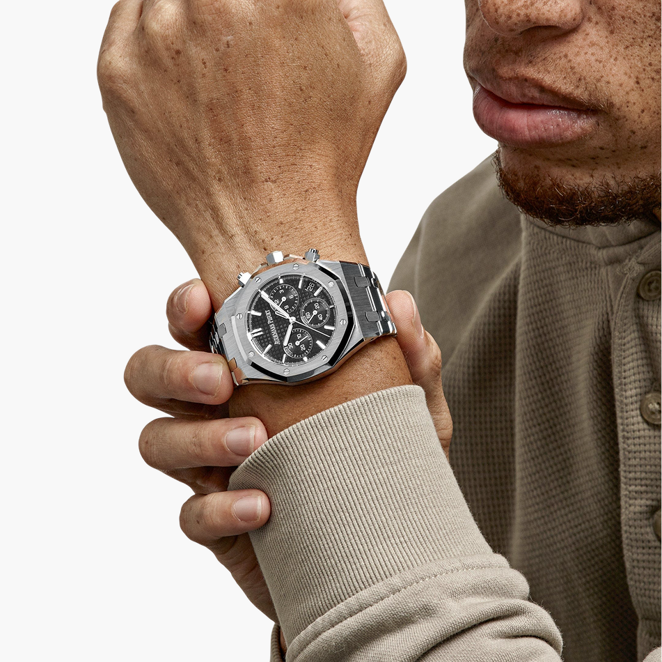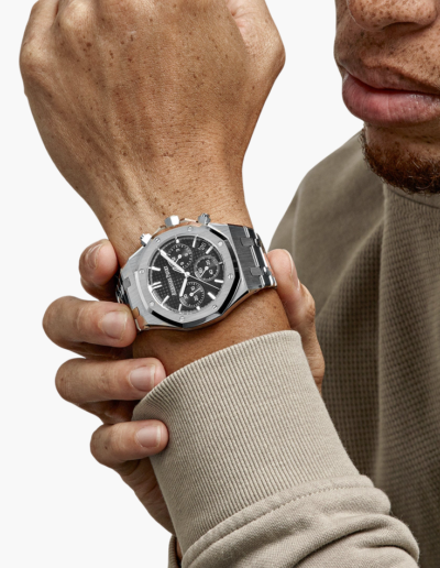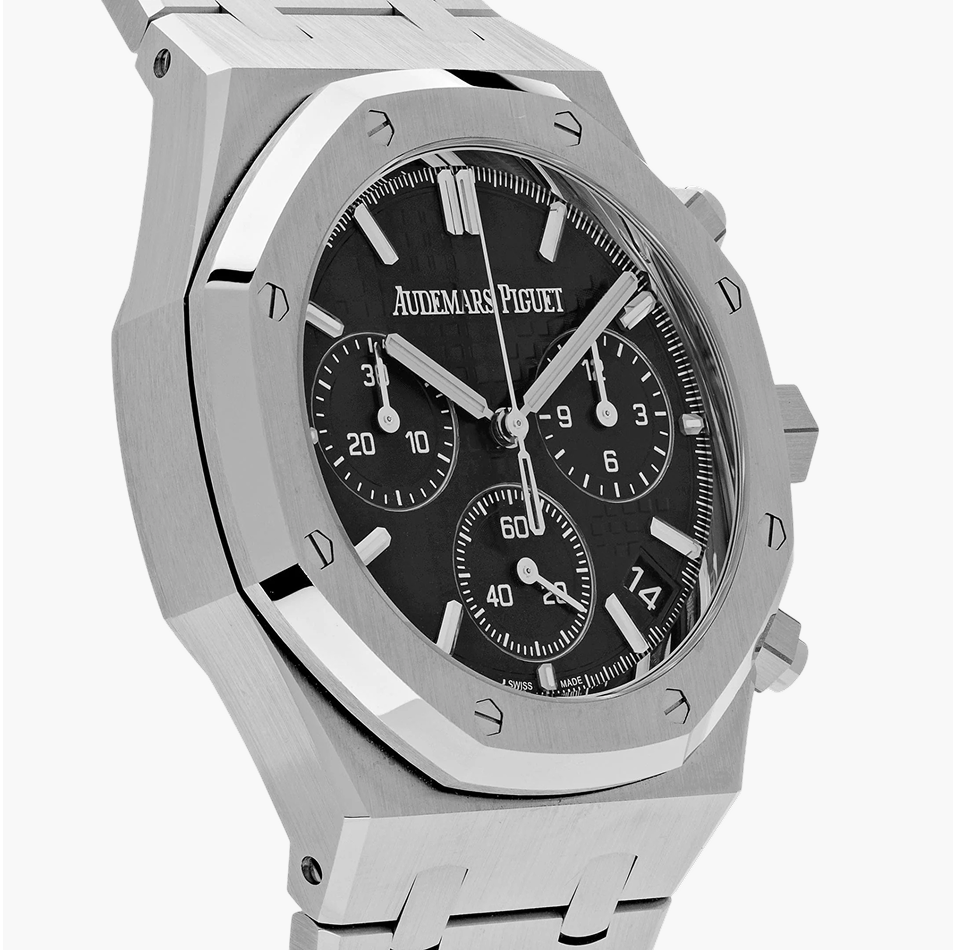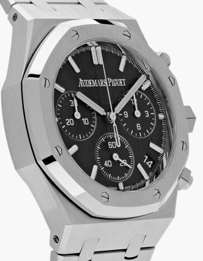 The Audemars Piguet Royal Oak Selfwinding Chronograph 41mm (Ref. 26240ST.OO.1320ST.06) features a stainless steel case and bracelet with the iconic octagonal bezel. Its black “Grande Tapisserie” dial includes three chronograph sub-dials and a date display. Powered by the in-house Calibre 4401 automatic movement with a 70-hour power reserve and flyback chronograph function, it combines sporty elegance with technical sophistication. The watch is water-resistant to 50 meters, making it a refined yet versatile timepiece.