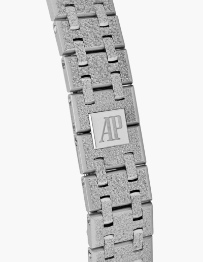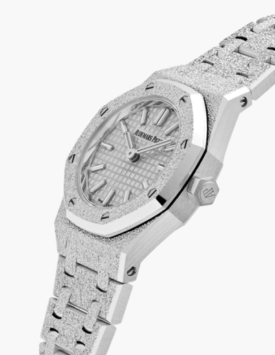 Inspired by the Mini Oak of 1997, this 23 mm contemporary interpretation features an 18-carat white gold case and bracelet decorated with Frosted Gold and set off by a tone-on-tone Petite Tapisserie dial. It is powered by quartz Calibre 2730.