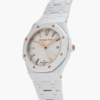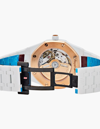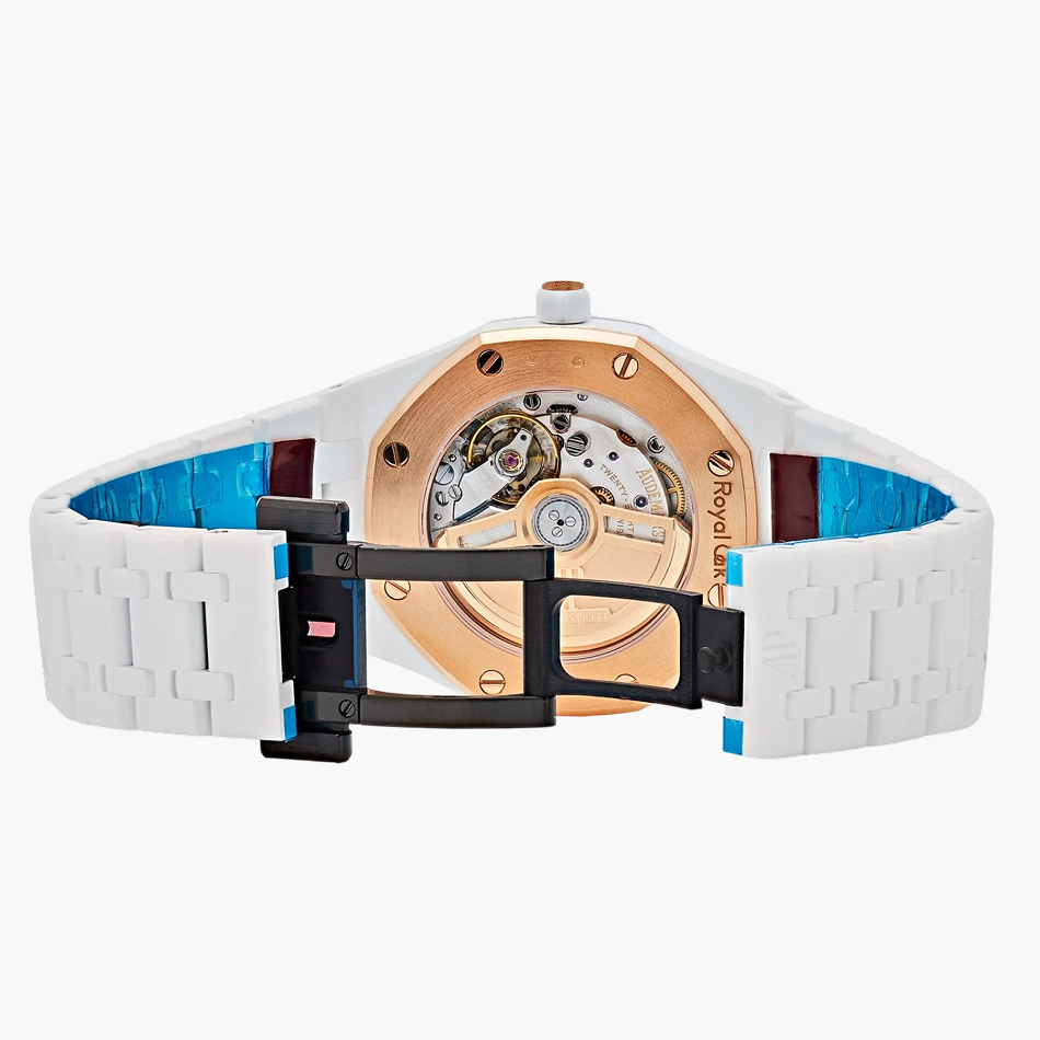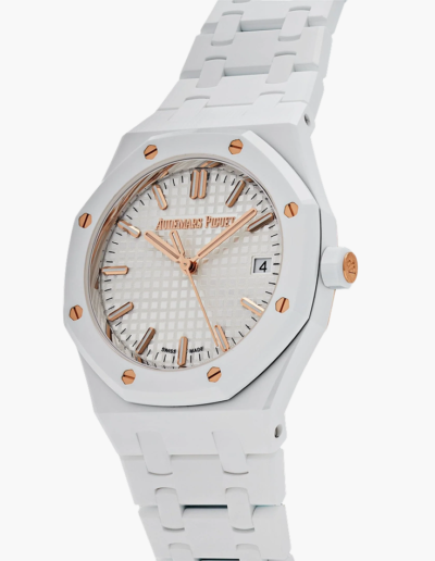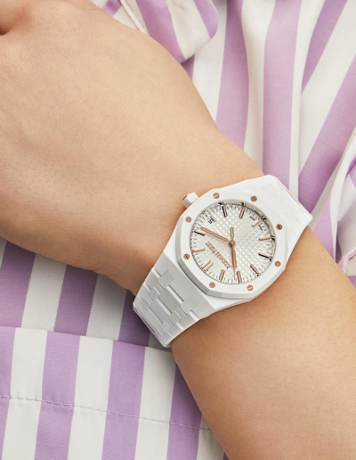 The introduction of white ceramic into this 34 mm Royal Oak, along with the addition of a silver-toned “Grande Tapisserie” dial and pink gold accent, adds a touch of glamour to this iconic timepiece.