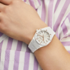 White ceramic case, glareproofed sapphire crystal and pink gold caseback.
