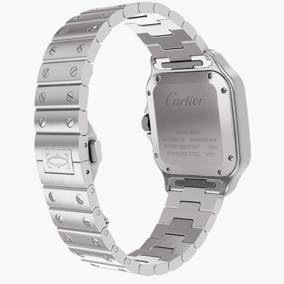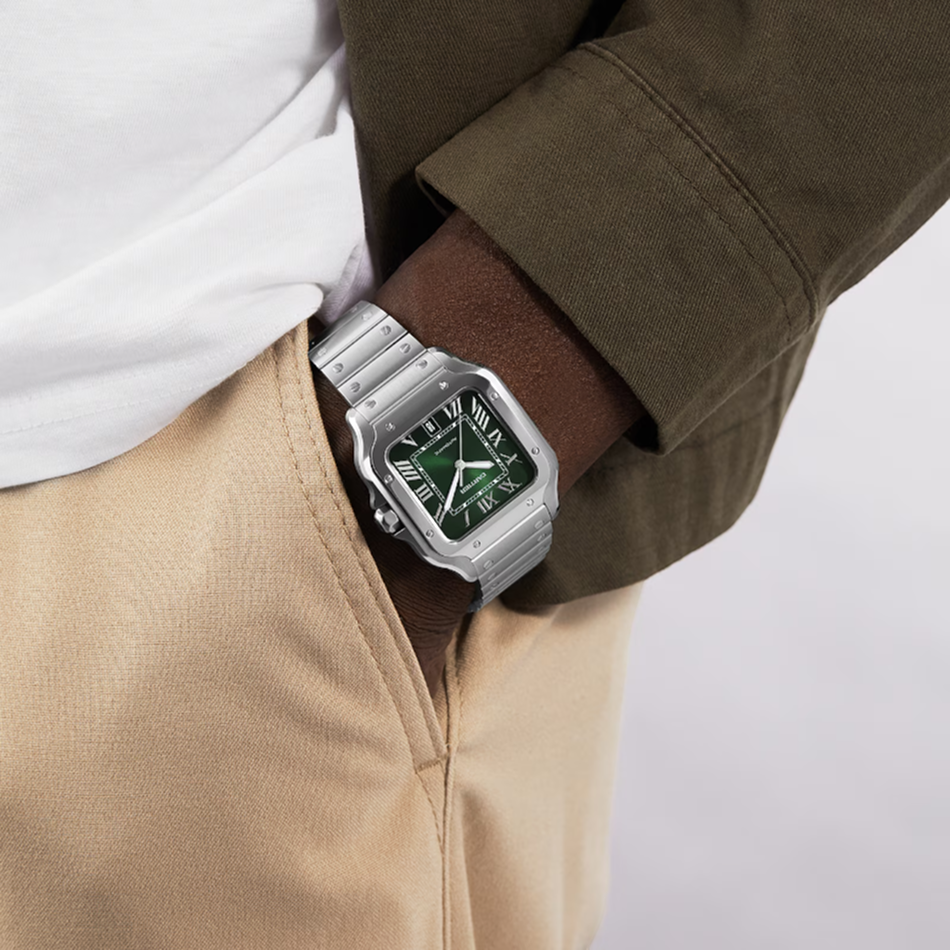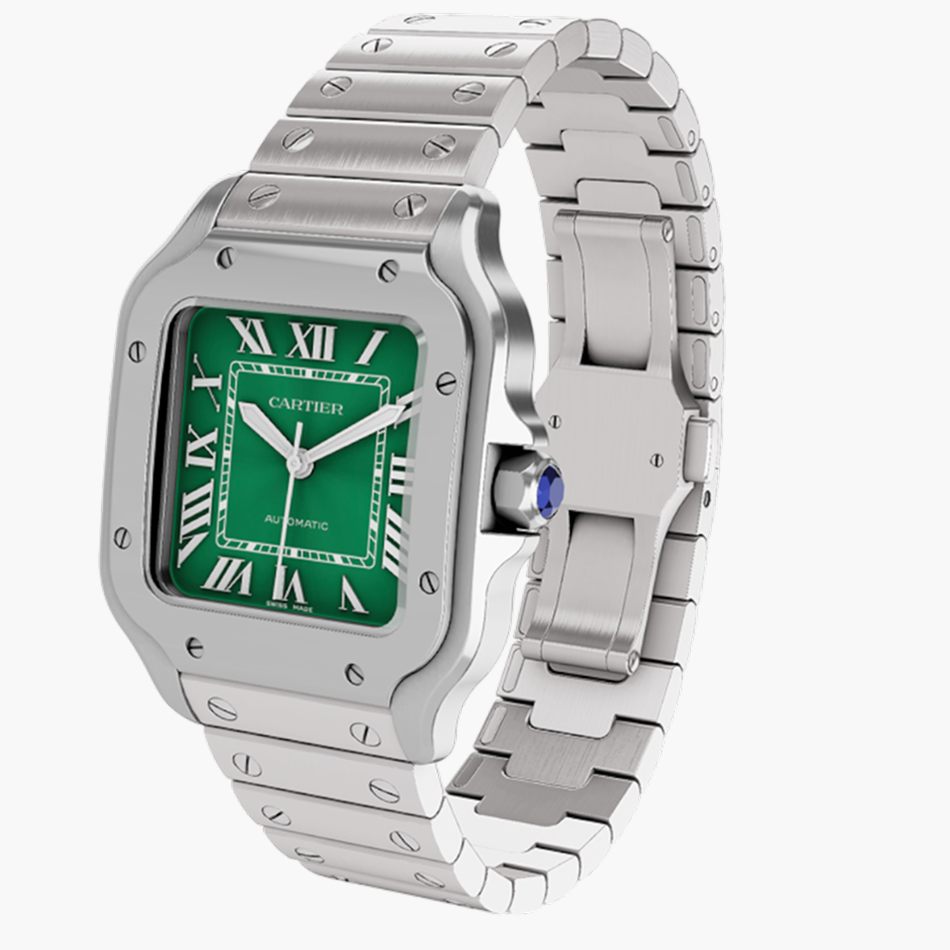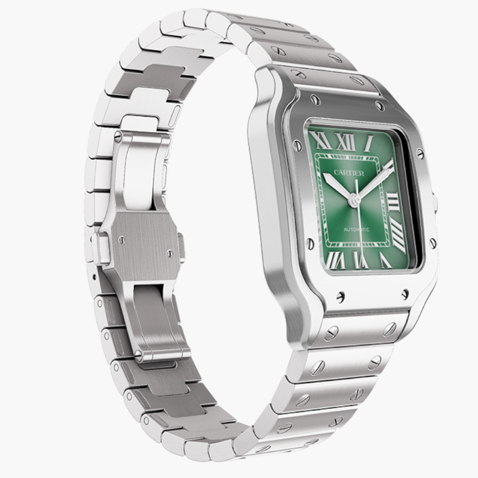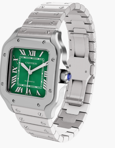 The Cartier Santos de Cartier Large Green Dial offers a contemporary interpretation of one of Cartier’s most iconic designs. Featuring a rich green Roman numeral dial, this model retains the instantly recognisable square case with exposed screws that define the Santos collection. Crafted in stainless steel, it balances refined elegance with everyday versatility. Rooted in early aviation history, the Santos remains a cornerstone of Cartier watchmaking with enduring appeal among collectors.