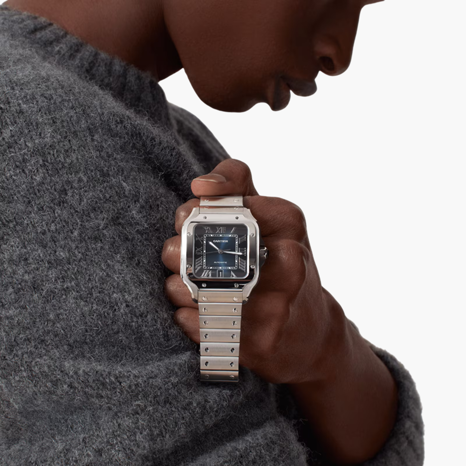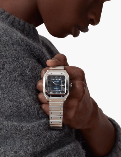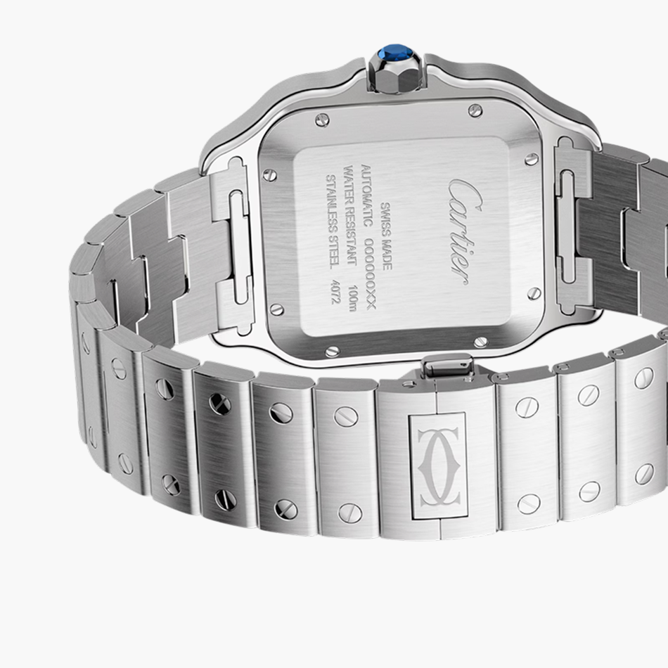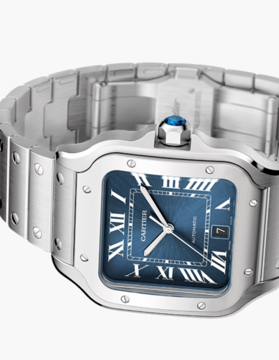 True to Cartier’s heritage of innovation, the Santos De Cartier Large Blue Dial Steel comes equipped with a range of complications, including a mechanical self-winding mechanism and a date display. The watch’s sapphire crystal glass provides crystal-clear visibility of the intricate mechanics at work, adding to its allure.