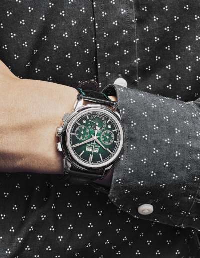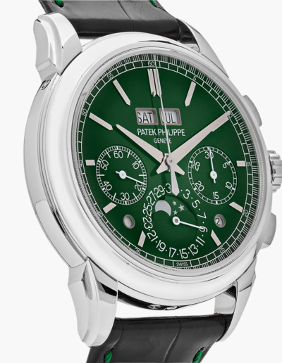 The Patek Philippe 5208P is a flagship grand complication combining a minute repeater, perpetual calendar, and chronograph in a platinum case. At 42mm, it carries significant presence while remaining exceptionally refined in finishing and execution. Offered pre-owned (2018), this reference sits at the top of modern Patek Philippe collecting for complexity, rarity, and long-term prestige.
