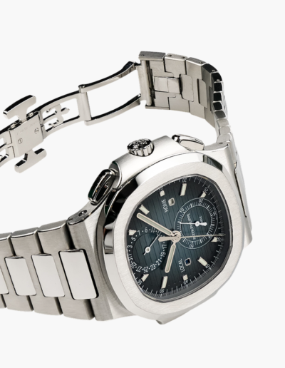 This versatile timepiece, designed for global travelers, combines the iconic Nautilus design with practical features. The 40.5mm stainless steel case features a sunburst blue dial with a black-gradient rim, adding a touch of sophistication.