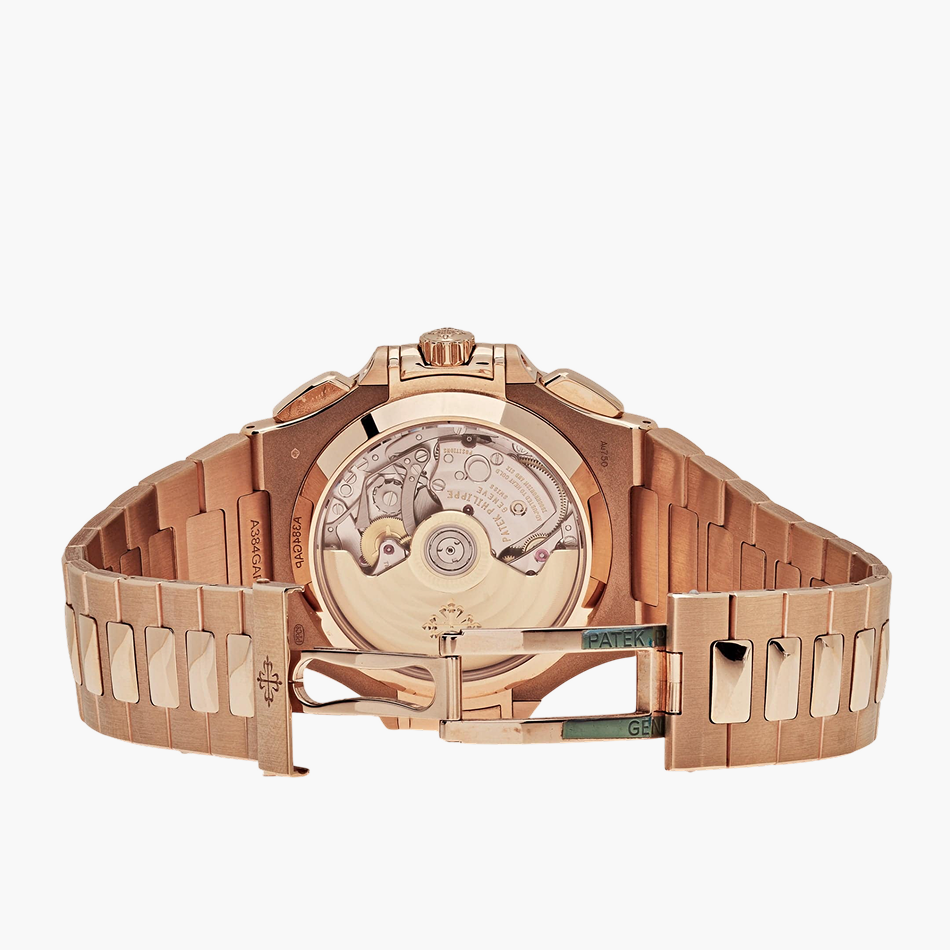 Patek Philippe Nautilus 5980/1R-001 — Iconic Nautilus in rose gold with a black dial, featuring a self-winding flyback chronograph and date.