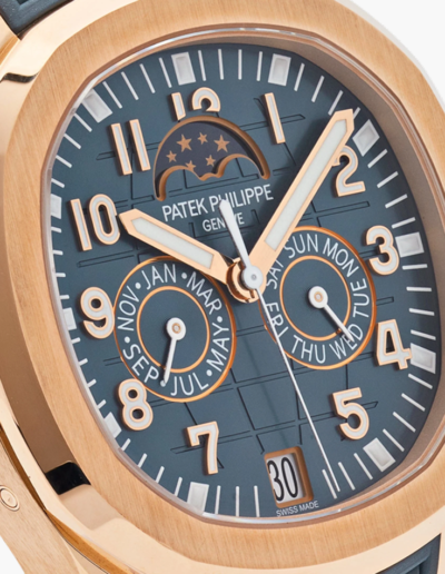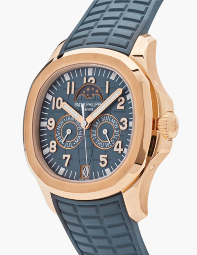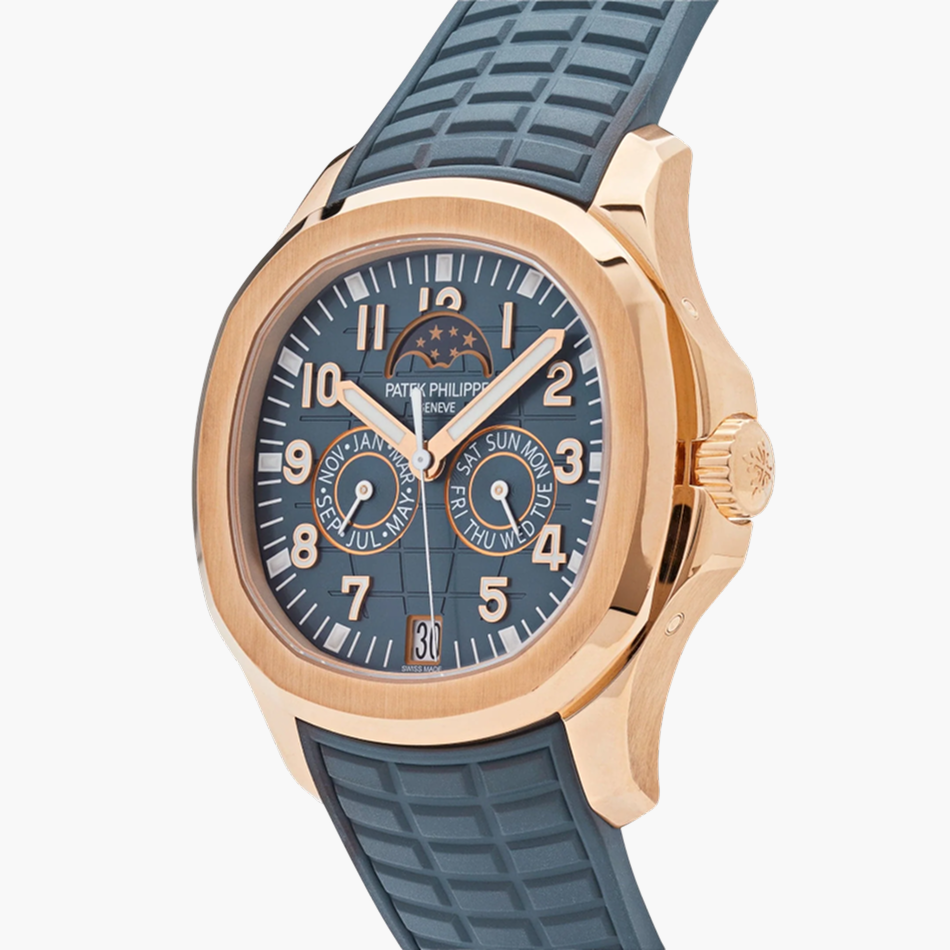 The Philippe Patek Aquanaut Perpetual Moonphase is an elegant timepiece with a sporty yet refined design. Encased in luxurious rose gold, it features a perpetual moonphase complication, accurately tracking the celestial phases.