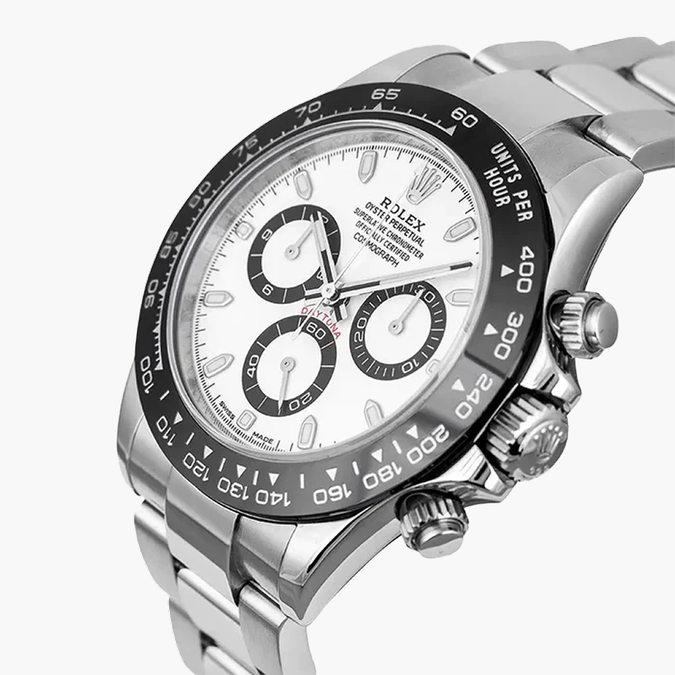 The Rolex Cosmograph Daytona 116500LN Panda is one of the most sought-after modern luxury sports chronographs. Its white “Panda” dial with contrasting black sub-dials is instantly recognisable and has become a defining configuration of the contemporary Daytona line. Crafted in Oystersteel, the 40mm case is paired with a black Cerachrom ceramic tachymeter bezel engineered for durability and long-term wear. Originally designed for professional motorsport timing, the Daytona has evolved into a benchmark Rolex sports watch with consistent global demand, making this reference highly desirable for collectors and long-term ownership.