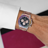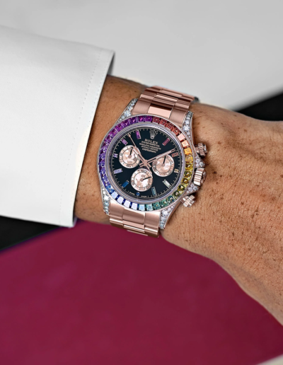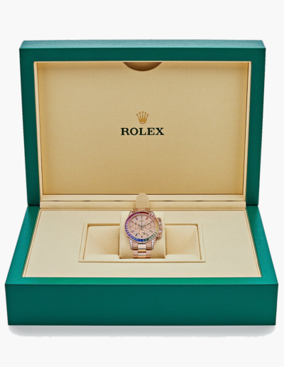 The Rolex Daytona 40mm 116595RBOW is a masterpiece of horology. Its 40mm case is crafted from 18k rose gold and features a stunning rainbow-set diamond bezel. The dial is adorned with rainbow-set diamond hour markers, adding to the watch’s dazzling allure.